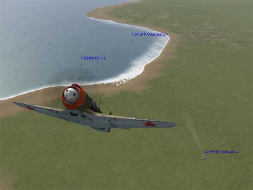 ГОРКА. Вот как описывает маневр ГОРКА А. Покрышкин (Небо войны): «Используя излюбленный прием, круто, почти вертикально веду самолет вверх. Надо набрать высоту…… Скорость падает. Переваливаю самолет на правое крыло. Об этом я подумал, как только пошел на горку……. Выравниваю самолет по горизонту и вижу: немцы подо мной.» А это описание использования горки в бою Г. Графа : «Но у МИГа все же есть ахиллесова пята – скороподъемность….. Делаю крутую горку, здесь русский должен отстать от меня, по крайней мере, я рассчитывал на это, если этого не произойдет – мне не уйти от него – стрелять он умеет. Наконец достигаю высшей точки, где инерции и мощности мотора уже не хватает для подзема, самолет на мгновение замер в воздухе, теряя управляемость, я съежился за бронеспинкой - сейчас может последовать удар противника, и стал заваливаться на крыло. Русский, как я ожидал, отстал от меня на подъеме и сейчас представлял прекрасную цель». Таким образом маневр «горка» заключается в резком наборе высоты, причем под углом к земле не превышающим 90 градусов. При выполнении горки плоскость самолета не должна иметь крена на крыло, чтобы не допустить преждевременного сваливания самолета вправо или влево. В критической (верхней) точке во избежания сваливания в штопор газ можно сбросить. Закрылки не используются. Выход из мертвой точки может быть осуществлен различными вариантами – заваливанием самолета на крыло, вперед, или заваливанием на крыло и дополнительным разворотом педалями рудера, но это отдельный прием (См. главу "Разворот на горке"). В верхней критической точке горки, для выхода вперед или при сознательном крене, сброс газа увеличивает плавность и быстроту выхода. Скорость сваливания для почти всех самолетов находится в пределах 120-130 км/час, а включение форсажа при выполнении горки лишь незначительно оттягивает достижение критической скорости, но не уменьшает скорость сваливания. Так же следует добавить, что выполнение горки совсем не обязательно доводить до сваливания самолета. Иногда бывает достаточно лишь оторваться по высоте от противника (или просто набрать необходимую высоту), а затем выровнять самолет в горизонтальной плоскости и начать набор скорости. Можно так же начать плавный разворот. Минимальная скорость, позволяющая начать прямолинейное движение или разворот без сваливания составляет примерно 150-160 км/час. На представленном треке 0203001 показано выполнение горки в различных вариантах, с выходом вперед и на 90 градусов с заваливанием на крыло, со сбросом газа и без него. Во всех вариантах самолет доводится до скорости сваливания. На втором треке 0203002 представлен тренировочный бой Мессершмита (преследуемый) и Ла-5ФН (преследователь). Серией последовательных «горок», выполняемых в различных вариантах исполнения, самолет преследователя пропускается вперед. Такой маневр возможен только при преимуществе в скорости перед противником. В данном случае (на треке) предпосылкой для отрыва «горкой» является потеря скорости противником при выполнении изначально крутого виража для захода в хвост преследуемому (расчетно противник при выполнении виража на 180 градусов может потерять скорость до 100 км/час), а так же преимущество в скороподьемности Мессершмита. Следует обратить внимание, что ряд последовательных «горок» достаточно рискова