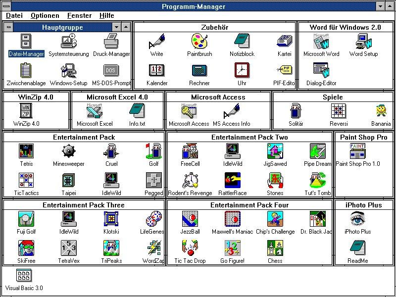 | Windows 3.00 | Mit Windows 3.00 gelang Microsoft 1990 der Durchbruch. Deutlich bunter und einfacher dank neuer Manager war Windows 3.0. Dank Visual Basic wurde Windows auch für Programmier interessant. | ![]() |