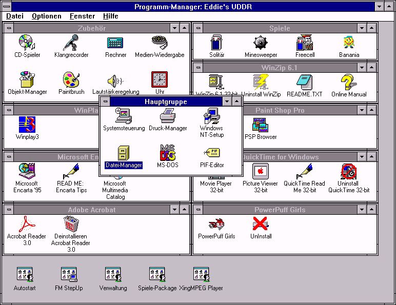 Kurz vor Windows 95 erschien Windows NT 3.51, das letzte Windows mit Programm-Manager. Hauptunterschied ist die Optimierung zu Windows 95, viele Elemente wurden übernommen wie Hilfe, Steuerelemente. SP5 ist das neuste Service Pack für NT 3.51 mit dem Office 97 läuft :-) | ![]() |
