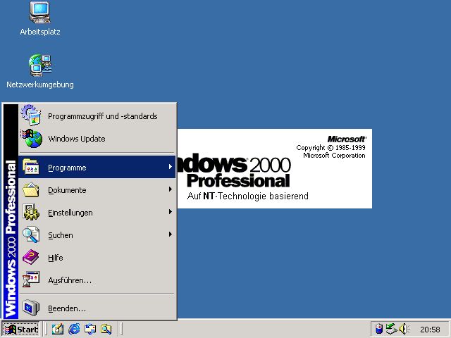 Dann vergingen fast 4 Jahre bis Windows NT 5.0, welches Anfang 2000 erschien. Die erste Beta erschien 1997, die zweite 1998 und die dritte Anfang April 1999.Neuerungen sind zahlreich: Plug and Play, FAT32, NTFS 5.0, Geräte-Manager, DirectX und erhöhte Spiele-Kompatibilität. Es gilt als das stabilste Windows bisher. | ![]() |